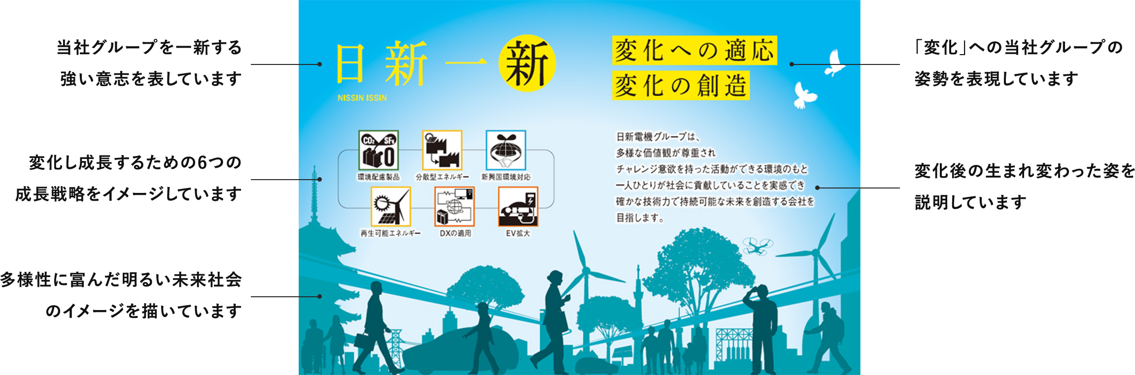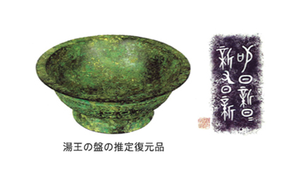 「日新」という社名の由来は、中国の古典である四書の一つ「大学」に記された、殷王朝(紀元前17~11世紀)の創始者である湯王が使っていた盤(洗面器)の銘文にあります。