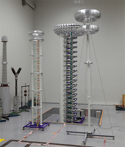 High voltage test equipment is designed for conducting high voltage tests using DC, AC, and impulse waveforms. A typical example of the equipment is an impulse voltage generator, which generates impulse voltages simulating lightning and is used to conduct withstand voltage tests and dielectric breakdown tests on various types of electrical equipment and insulation materials. In addition to products manufactured in-house, we sell and maintain high voltage test equipment and special measuring instruments manufactured by Haefely AG, a Swiss company with a high global market share.