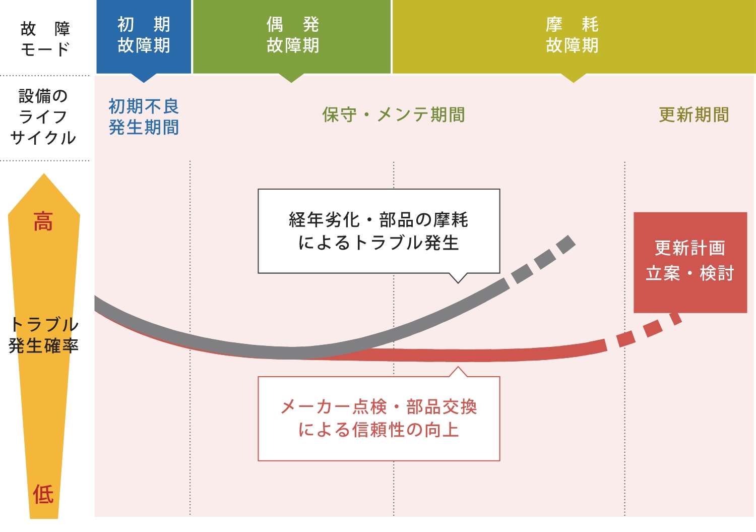 電気設備は長寿命ではありますが、経年劣化や部品の摩耗は避けることができません。また、不具合が生じれば施設運営や操業に大きな影響を及ぼします。そこで、適切な点検・修繕を行い設備の信頼性向上を図ることで、長く設備を使い続けることができます。