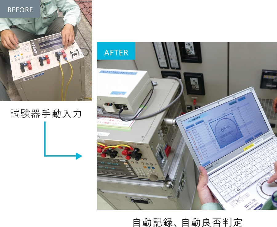 保護継電器の自動試験装置導入による点検作業の自動化や、当社オリジナルの診断装置と設備診断による保守点検・劣化診断の実施など、作業効率化とサービス品質の向上に取り組んでいます。