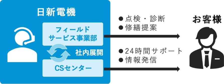 お客様のお困りごとに対応するため、24時間365日の緊急連絡体制を構築し、お客様の声を集約・分析して社内に展開する「CSセンター」や、お客様に電子メールで設備トラブル防止対策・Q&Aなどを発信する「テクノレター」など、お客様が安心して設備を使用するためのサポートを行っています。
